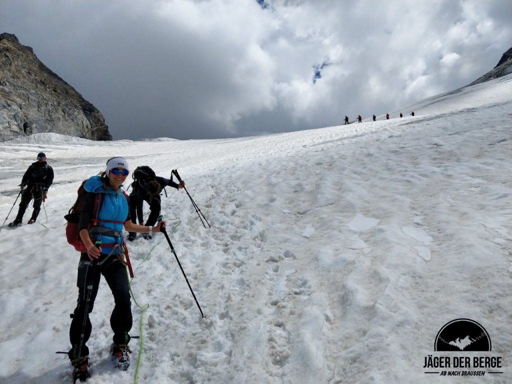 In anfangs noch moderaten Firngelände schoben wir uns Höhenmeter für Höhenmeter weiter den Gletscher nach oben. Da eine Gruppe etwas voraus geeilt war, zog unser eigenes Tempo automatisch an, was dann auch den Abriss von einigen zur Folge hatte.