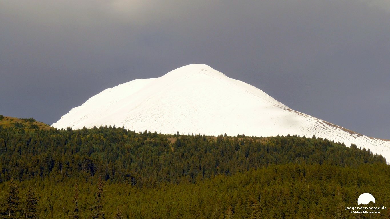 Am darauffolgenden Tag nehmen wir uns den Whistlers Peak als Ausflugsziel fest ins Auge. Das Wetter schein gut zu werden und so machen wir uns recht früh zum Supermarkt auf um noch ein wenig Proviant einzukaufen. Mit dem Auto geht es dann eine knappe halbe Stunde die Passstraße zur Seilbahn hinauf. Nach einiger Überredungskunst steigen wir schließlich in die freihängende Gondel und fahren dem Berg entgegen. An der Bergstation trennt sich der Ausflugsmob von den etwas ambitionierteren die doch auch den Gipfel erreichen wollen. So spaltet sich ein wirklich kleines Grüppchen ab und trottet auf einem ausgetreten Schotterweg den Gipfel entgegen. Nach einigen Höhenmetern verschwindet der Weg unter einer leichten Schneedecke. Wir bahnen uns den Weg weiter hinauf und finden einen herrlichen Platz zum Rasten. Von unserem Felsblock, der eine wohlige Wärme ausstrahlt, schauen wir uns dieses prächtige Panorama an welches sich uns hier bietet. Vor unseren Füßen liegt Jasper und ringsherum eine traumhaft schöne Bergkulisse.