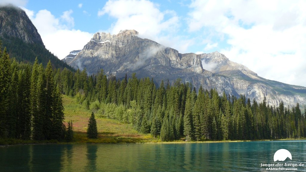 Dort angekommen ist man von dem für die Abgeschiedenheit doch recht üppig ausgefallenen Busparkplatz etwas enttäuscht. Vor uns schob sich ein Mob aus FlipFlop-Touristen dem Flußufer entgegen. Wir hielten uns etwas zurück und fanden dann doch am Ufer ein zwei Stellen um die Gegend in Ruhe bewundern zu können. Der See ist nicht besonders groß, liegt aber traumhaft schön umgeben von Wapta Mountain, Michael Peak und eben dem Emerald Peak. Was die Ganze Szenerie irgendwie besonders macht, ist die kleine Bewohnte Insel des Emerald Lake mit ihren Türkisfarbenen Dächern schmiegen sich die Häuser perfekt in die Landschaft ein. Wenn man die Möglichkeit hat sollte man hier auf jedenfall ein paar Tage verbringen und die umliegen Wälder und Berge erkundschaften.