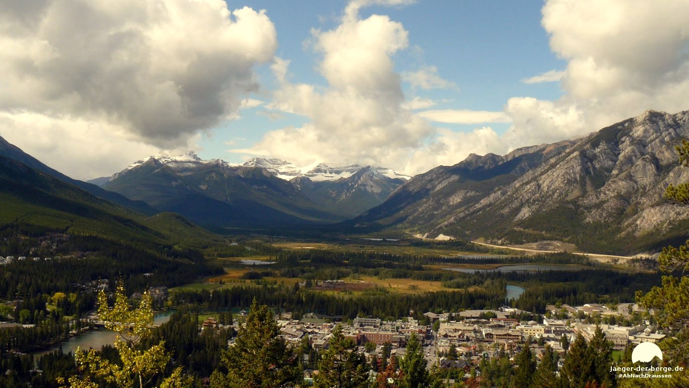 Dies ist eine ziemlich volle Stelle, da sich just in dem Moment an dem wir ankommen eine große Reisegruppe in drei orange leuchtende Raftingboote stopft. Ein zugegebenermaßen sehr lustiges Schauspiel. Die Gruppe fährt langsam von dannen und so können wir die Blicke etwas schweifen lassen und sehen allmählich auch die ersten blauen Stellen in der trüben Wolkendecke. Der Wasserfall hat es nicht nur uns sondern auch einem Brautpaar angetan, welches sich recht nah an den herabstürzenden Wassermassen ablichten läßt. Wir lassen den Fluß links liegen, gehen die Böschung nach oben und erkennen ein lustiges Restaurant-Schild „The Waldhaus Restaurant“. Leider hat es heute Ruhetag, so lassen wir den Tag mit einem Stadtbummel ausklingen. Der Tunnel Mountain wird heute erklommen. Keine wirkliche Herausforderung beim Anblick der umliegenden Riesen. Trotzdem ist es ein muss vom Tunnel Mountain die herrliche Aussicht mitzunehmen. Mit Mount Rundl und der dahinterliegende Bergkette Rundl 1-7 kann man sich schon mal ein sehr spannendes, zukünftiges Projekt für eine Mehrtagestour ansehen. Das riesige in britischem Stil gehaltene The Fairmont Banff Springs Hotel fällt einem genauso ins Auge wie der nicht wirklich passende Golfclub. Davon einmal abgesehen ist es wirklich ein schöner Fleck um ein bisschen zu verweilen und natürlich zum vollknipsen der Kamera. Auf dem Rückweg zum Hotel lassen wir es uns nicht nehmen im Norden von Banff den Lake Minewanka anzusehen. Aufgrund der doch recht fortgeschrittenen Zeit reicht es allerdings nicht mehr den See ausgiebig zu erkunden. Wir sind zurück im Hotel und leuten die Letzte Nacht ein. Am Abreisetag fahren wir noch ein paar Serpentinen des Snow Peak hinauf und verabschieden uns von einem sehr schönen fleckchen Erde. Bye, Bye Banff und auf in den nächsten schönen Ort. Jasper wartet auf uns.