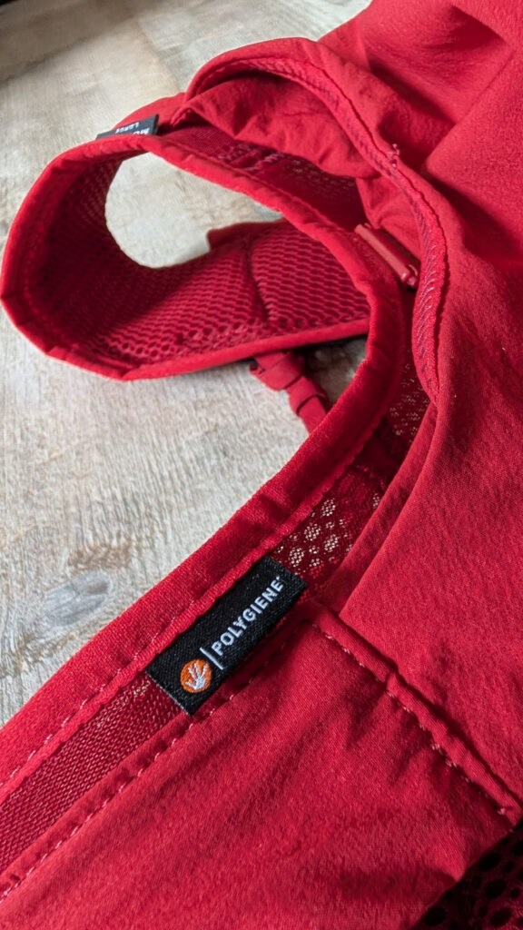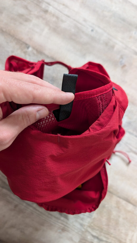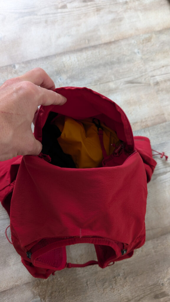Das eigentliche Hauptfach wird mit einem Reißverschluss verschlossen und hat ein Volumen von – ihr habt es schon erraten – 12 Litern und einem „+“. Denn das Mesh-Material ist extrem dehnbar, sodass hier noch einiges mehr in den Montane Gecko VP 12+ hineinpasst. Wem das allerdings immer noch nicht reicht, der kann mit dem auf der Tasche angebrachten Gummizug noch zusätzlich Ausrüstung wie eine Jacke außen befestigen.