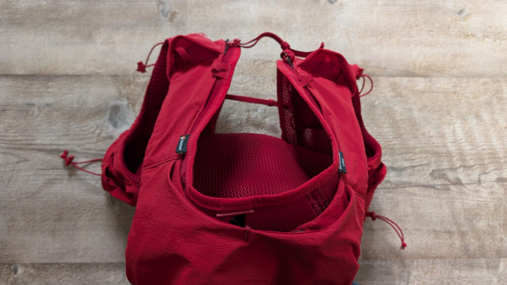 Die Gecko VP12+ hat zwei große Fächer auf der Rückseite. Das Fach direkt am Rücken dient dabei allerdings nur der Trinkblase, die hier gut verstaut werden kann. Alternativ findet hier vielleicht auch die Regenjacke für den schnellen Zugriff Platz.