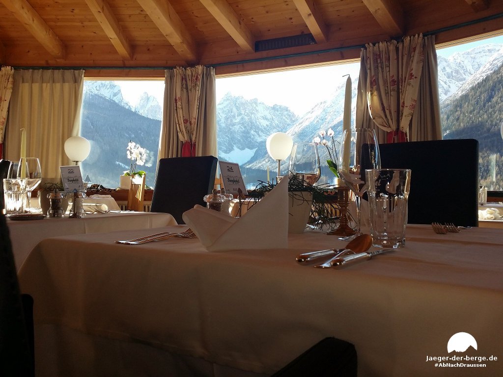 Nach langem hin und her hatte ich mich entschieden. Das Berghotel in Sexten sollte es sein. Es ist schön gelegen und für unsere Tour der perfekte Startplatz um zu den Drei Zinnen aufzubrechen. Zudem liegt es direkt am Skigebiet (was wir ja leider nicht wirklich nutzen konnten) Im Inneren strahlt das Hotel von allen Wänden regelrechtes Bergsteigerfeeling aus. Ein Bild reiht sich an das andere, man könnte einige Minuten allein im Treppenhaus verharren und die Geschichte um einen der Erstbesteiger der Drei Zinnen Franz Innerkofler durchzulesen. Das Hotel ist sehr geschmackvoll eingerichtet. Der Restaurantbereich kann sich mit dem freien Blick auf das Fischleintal und den dort stehenden Bergen wie etwa die Rotwandköpfe, Einser und Altenstein absolut sehen lassen.